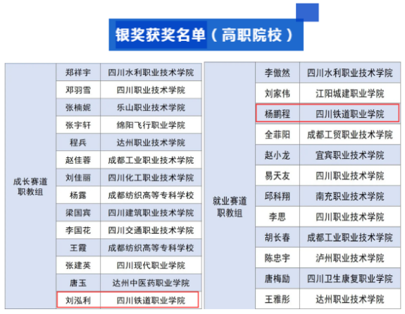 近日,由四川省教育厅、人力资源和社会保障厅联合主办,四川省高校学生信息咨询与就业指导中心、人才交流中心及泸州职院技术学院共同承办的四川省第二届大学生职业规划大赛全省决赛(职教组)中,我校斩获成长赛道和就业赛道2项银奖,取得了在该赛项的重大突破!