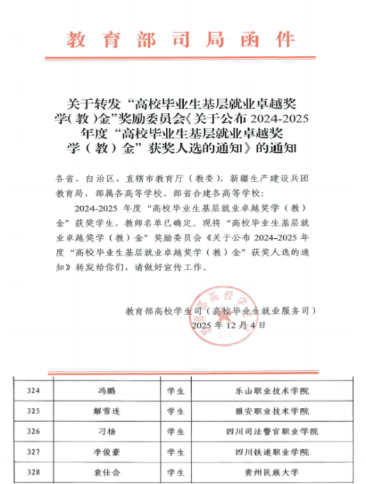 近日,教育部高校学生司公布2024—2025年度“高校毕业生基层就业卓越奖学(教)金”获奖名单,我校机车车辆学院2020届毕业生李俊豪成功入选,成为全国418名获奖学生之一。该奖项由教育部高校学生司、教育部学生服务与素质发展中心指导,三峡集团出资设立,旨在表彰长期扎根基层、服务国家重大战略的优秀高校毕业生。